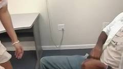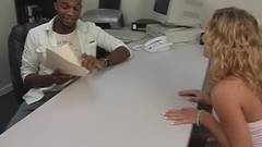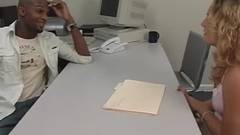 Esta jovem loira está com calores e decide ir ao médico, para que ele trate bem dela ! Este preto irá lhe saltar em cima !