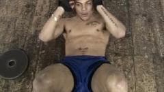 Este latino moreno adora bater punheta com suas proprias mãos na cama depois de um dia de exercicios para melhorar o seu fisico.