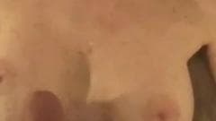 Ela está ansiosa para fazer seu homem ejacular e começa com um bom boquete antes de masturbá-lo e ele jogar sua porra nos seus peitos suculentos!