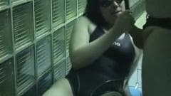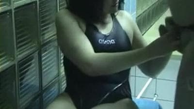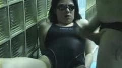 Esta nadadora está no vestiário com um amigo e ela não consegue resistir a ele por mais tempo e tem que pegar seu pau para poder sugá-lo!