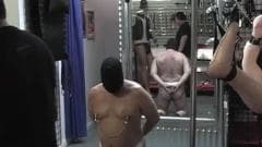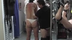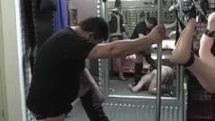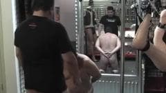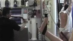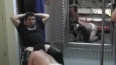 No ginásio, vemos este homem sendo punido por um amigo enquanto está amarrado, sem calças. Ele tem uma forma diferente de desfrutar.