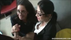 Estas duas secretárias surpreendem seu chefe vendo pornografia e elas aproveitam para masturbá-lo até ele largar sua porra nos rostos delas!
