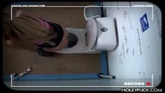 Esta puta loira se senta para se masturbar no banheiro esperando que saia alguma rola pelo buraco da parede para chupar