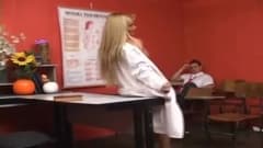 Este aluno foi castigado por mau comportamento e esta professora trans loira gostosa vai tratar do seu rabo. Este aluno é mesmo um sortudo.