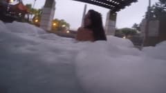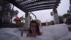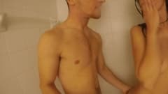 Ela mostra seu corpo sexy no jaccuzzi antes de sugar o pau no chuveiro e trepar com ele até fazê-lo ejacular em seu rosto.
