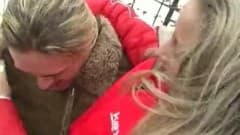 Ao chegar a casa, esta loira salta sobre o seu namorado. Ela está mesmo super excitada.