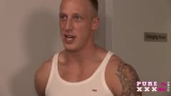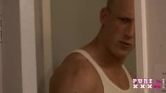Ele vai mostrar a esta loira onde estão os vestuários e ela aproveita para refrescar-se. O que nâo sabe é que está atrás da porta a espreitar !