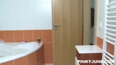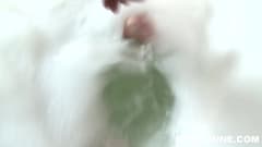 Esta bela jovem com peitos lindos, goza de uma bon banho relaxante para raspar sua buceta e acariciar-se, gemendo de prazer.