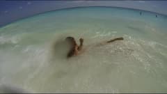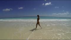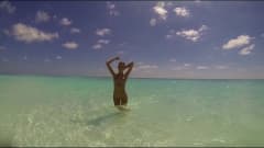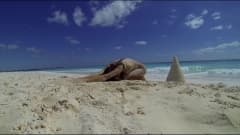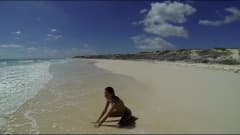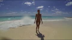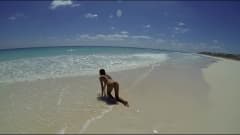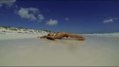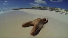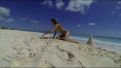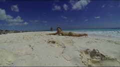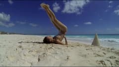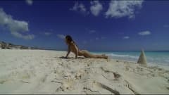 Esta jovem tesuda passeia nua na praia antes de parar para uma sessao de ioga onde podemos admirar suas belas formas.