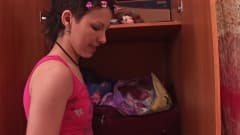 Esta morena bonita encontra seu vibrador ao arrumar seu armário e geme de prazer enfiando-o em sua buceta para matar saudades dele!