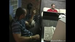 Esses dois caras negros dao os seus paus duros grandes a sugar a esse cara branco antes de uma boa sessao de sexo anal!