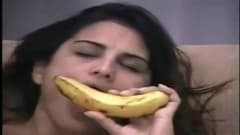 Esta bela morena acaricia sua vagina antes de pegar numa banana que ela faz entrar e sair em sua buceta ate ter um orgasmo!