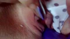 Este cara filme a buceta muito molhada de desejo de sua namorada enquanto ela se masturba com um vibrador e um grande dildo e ele a acariciar.