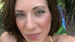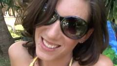 Esta bela morena vai se colocar confortável numa cama de praia ao ar livre e se masturbar ao ar livre com um dildo.