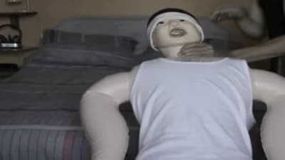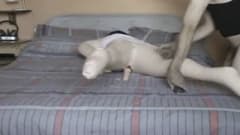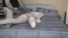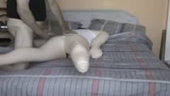 Esse cara coloca uma boneca insuflavel de barriga para baixo em cima da sua cama e começa a fodê-la ate a ejaculaçao final!