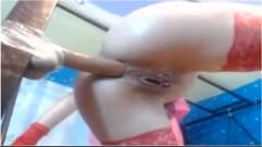 Esta moça vestida apenas com meias sexy e um sutiã vermelho coloca sua bunda em um grande dildo na parede, gemendo de prazer.