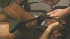 Muita coisa esta acontecendo no quartel do exército. Esses três decidiram transar com a ajuda de um grande dildo!
