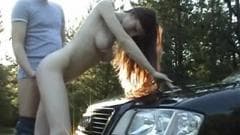 Neste vídeo amador nós gostamos de ver um casal excitado fodendo no capo de seu carro no meio de uma floresta! Nao perca!