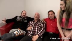 Duas jovens muito safadas chupam os cacetes desse grupo de velhos e fodem com eles até eles gozarem em suas bucetas e fazerem elas lamber tudinho.