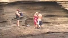 Krystal Steal e Jenna Haze filmadas em uma praia. A chupar e masturbar um cara e levar o seu pau em seus bichanos antes de ele explodir em seus rostos