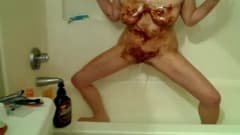 Ela está no banho e decide tentar algo novo! Ela se cobre em molho de chocolate e se masturba para nós! Não perca esta cena!
