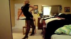 Esta linda loira gosta de dançar e acariciar-se para nós e ela está vestida com suas meias e seus saltos altos na frente da câmera!