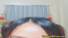 Essa transexual mostra sua habilidade de mamar na sua propria rola em frente à webcam antes de engolir sua propria porra