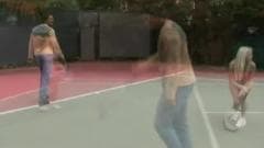 Essas mulheres são atletas bonitas que se dedicam ao prazer sexual no meio de um campo de tênis, com um cara que quer fodê-las.
