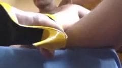 Este cara ama quando sua esposa usa seus sapatos amarelos e esfrega-os por todo o seu pau enquanto também apalpa seus mamilos!