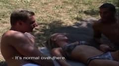 Este trio ao ar livre será entre bissexuais e uma mulher que vai gostar muito de vê-los chupando seus paus e partilhando seu prazer.