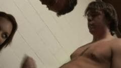 Esta morena está com dois homens que vão gozar no rosto dela, mas ela coloca uma proteção em seus olhos para que o sêmen não entre nela.