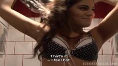 Jovem Checa recebe uma poposta bem pervertida. Ela aceita e vamos vê-la a ser fodida numa casa de banho pública com outras raparigas gostosas !