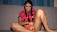 Morena gostosa gosta de se masturbar até ficar cheia de tesão para depois chupar um pau bem grande e duro e por fim levar com ele bem fundo até gemer