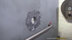 Ela vai a um banheiro público e vê um buraco na parede de onde surgirá um caralhão preto. Ela não perde tempo e começa a chupá-lo enquanto se masturba!