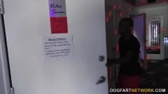 A morena com seios enormes Jasmine Jae vai a um sexshop. Ela visita a sala de vídeos e encontra glory holes de onde vão sair dois caralhos pretos gigantes!