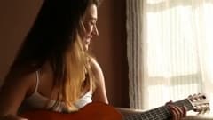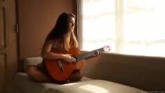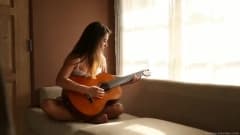 Eva Lovia é uma garota bonita e muito animada depois de tocar violão. Veja como ele puxa seu violão de lado!