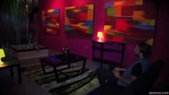 Uma garota de cabelos grandes e cabelos escuros dança sensualmente enquanto tira a roupa e chupa um pau grande e grosso.
