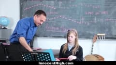 Ela precisa passar na aula de música. O professor ensina-a a dedilhar metendo os dedos na sua boceta. Ele vai lambê-la para estar relaxada para a trepada!