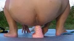 É ao ar livre que este cara vai enfiar um grande dildo em sua bunda, pois isso lhe dá o máximo de prazer