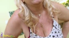 Esta avó loira peituda faz uso de seus enormes seios naturais quando se masturba na cozinha de sua casa
