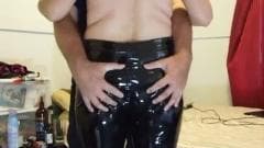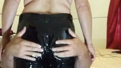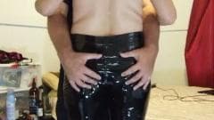 Este velho é muito sádico e quer ficar excitado com a bunda de uma mulher que vestiu umas calças de látex que marcam toda a sua figura.