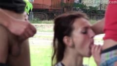 Essa garota é muito safada, além de foder ao ar livre ela gosta de foder com 2! Enquanto ela chupa o caralho de um o outro cara mete na boceta por trás!