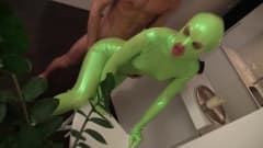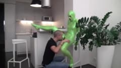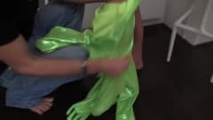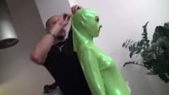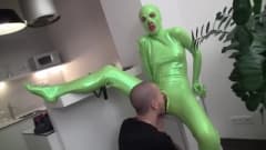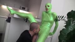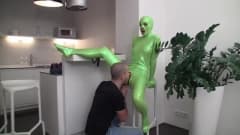 Seu cara tem um fetiche - um body de látex e uma cor verde, então para sexo a puta veste um traje e se deixa foder no chão em posições de ejacular na boca