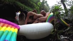 Um cara de sorte está tendo uma aventura sexual com três belas aventureiras que vão transar com ele em uma lagoa paradisíaca na selva.