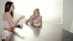A morena convida uma amiga para dormir na sua casa. Durante a noite o pai dela entra no quarto e começa a foder com a loirinha, que geme muito alto!
