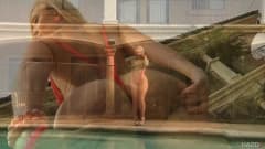 Loira e morena muito gostosas conversam seminuas a beira da piscina e começam a se pegar, comedor chega e elas não resistem em cair transar.