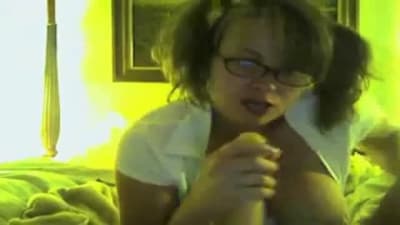 Jovem roliça mostra seus seios grandes naturais e fica mamando num cacete de borracha enquanto massaja sua buceta gordinha na net.