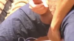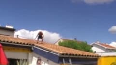 Enquanto este cara fixa as telhas do telhado, fica muito quente com o sol e isso faz com que ele se sinta um enorme prazer e desejo de se masturbar.