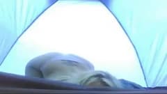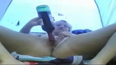 Uma linda jovem faz um video a exibir seus seios naturais e bundinha muito gostosa e ainda enfia uma garrafa na buceta dentro da tenda.