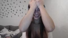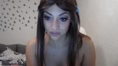 Uma linda garota morena se satisfaz, diante da câmera, com os novos brinquedos que comparou e que quer experimentar na frente da câmera.